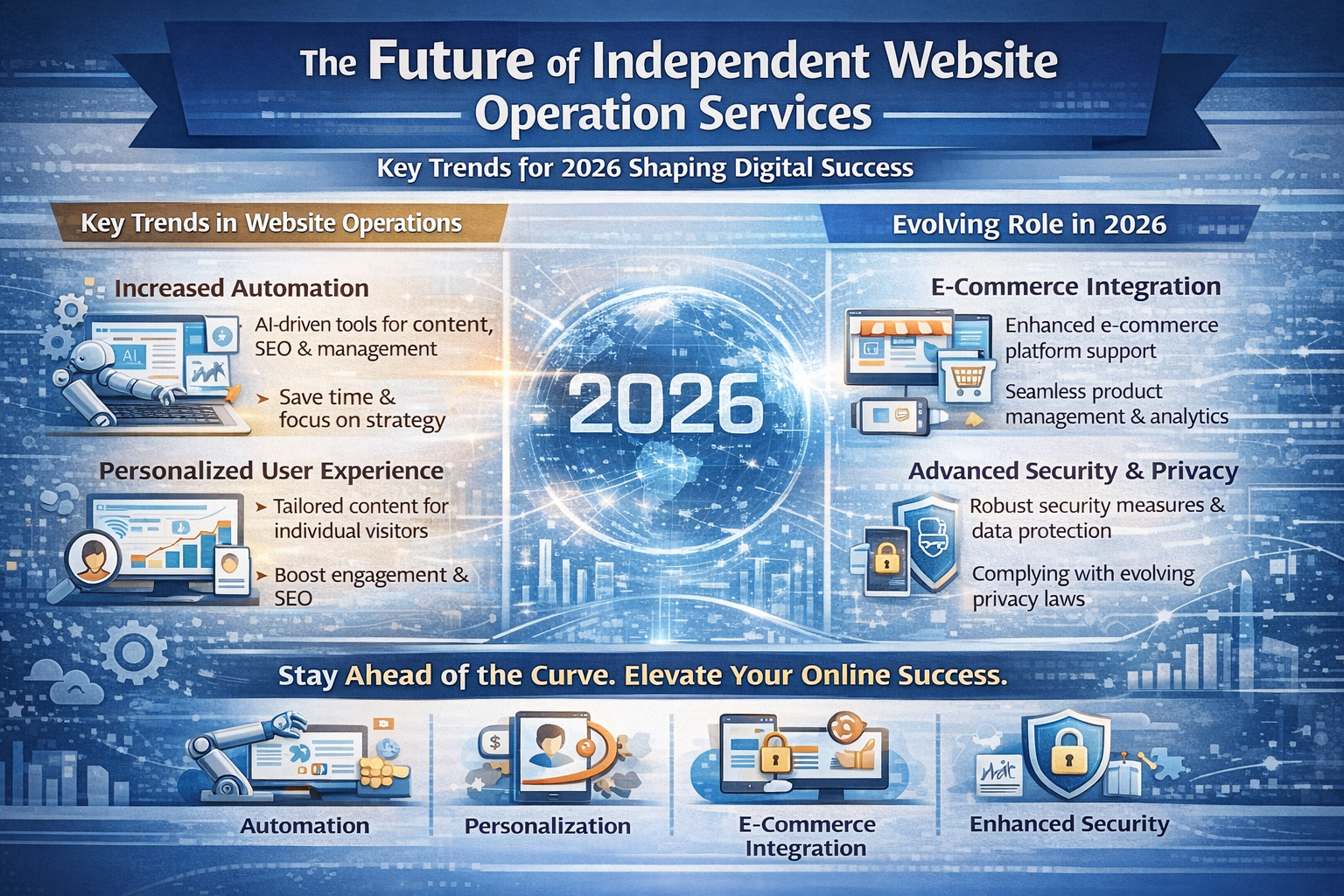 As the digital landscape evolves, independent website operation services will become more sophisticated and integral to business success. Trends such as increased automation, enhanced personalization, deeper e-commerce integration, and improved security will shape how businesses manage their websites in 2026. By staying ahead of these trends, companies can optimize their online presence, improve user experience, and drive greater business results. Independent website operation services will be at the forefront of this evolution, offering businesses the tools and strategies needed to thrive in an increasingly competitive digital world.